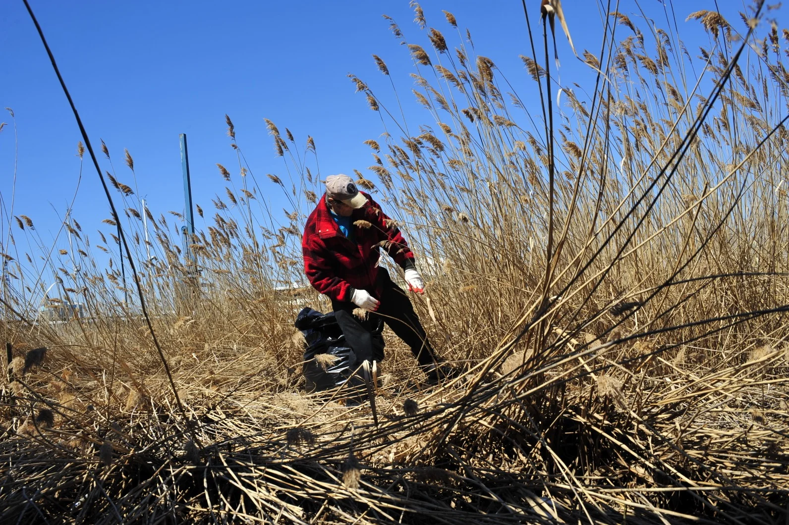 Joseph Englen worked the Island End Marsh filling his trash bag with bottles, glass, and other derbies that have washed up.