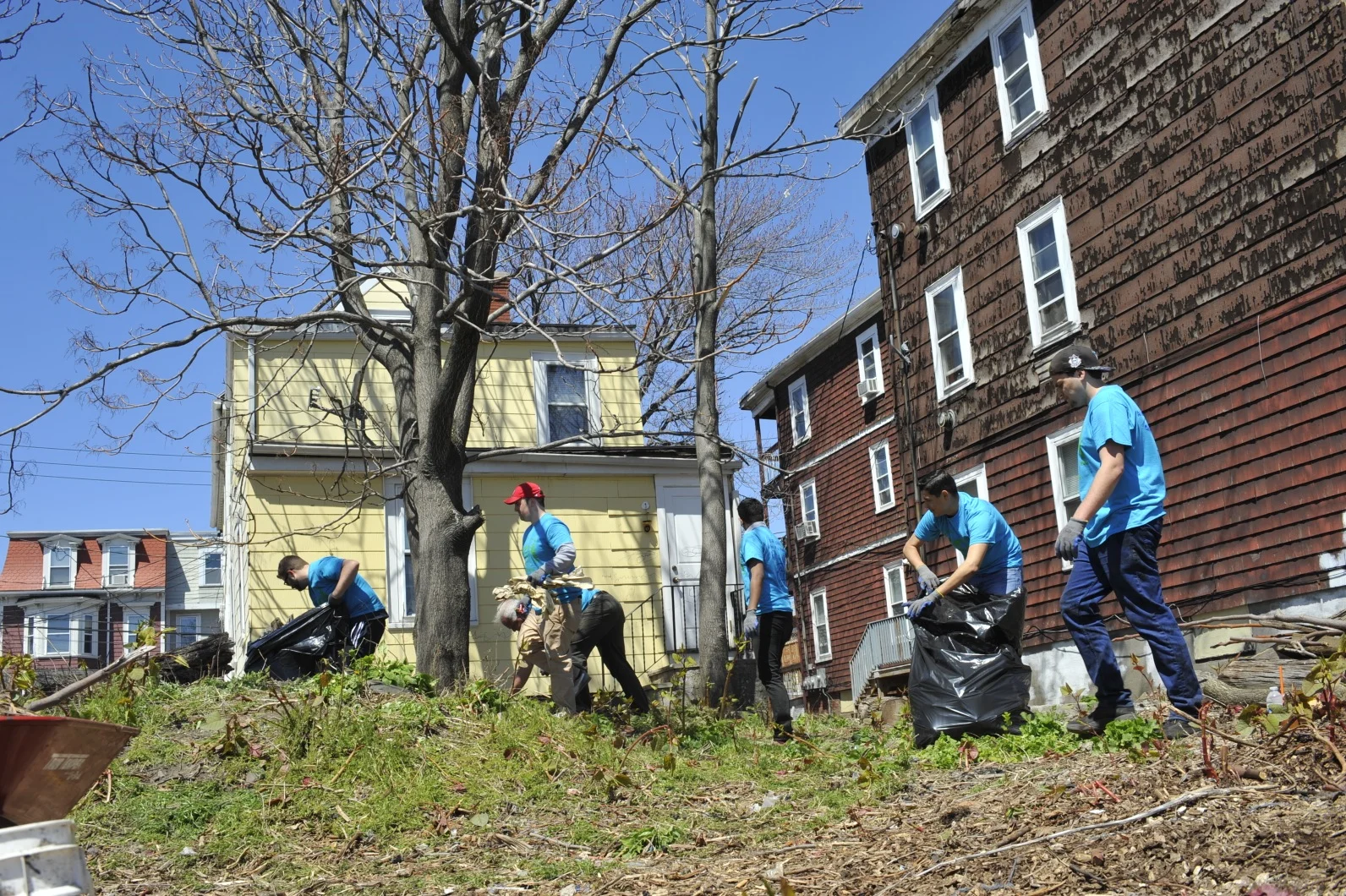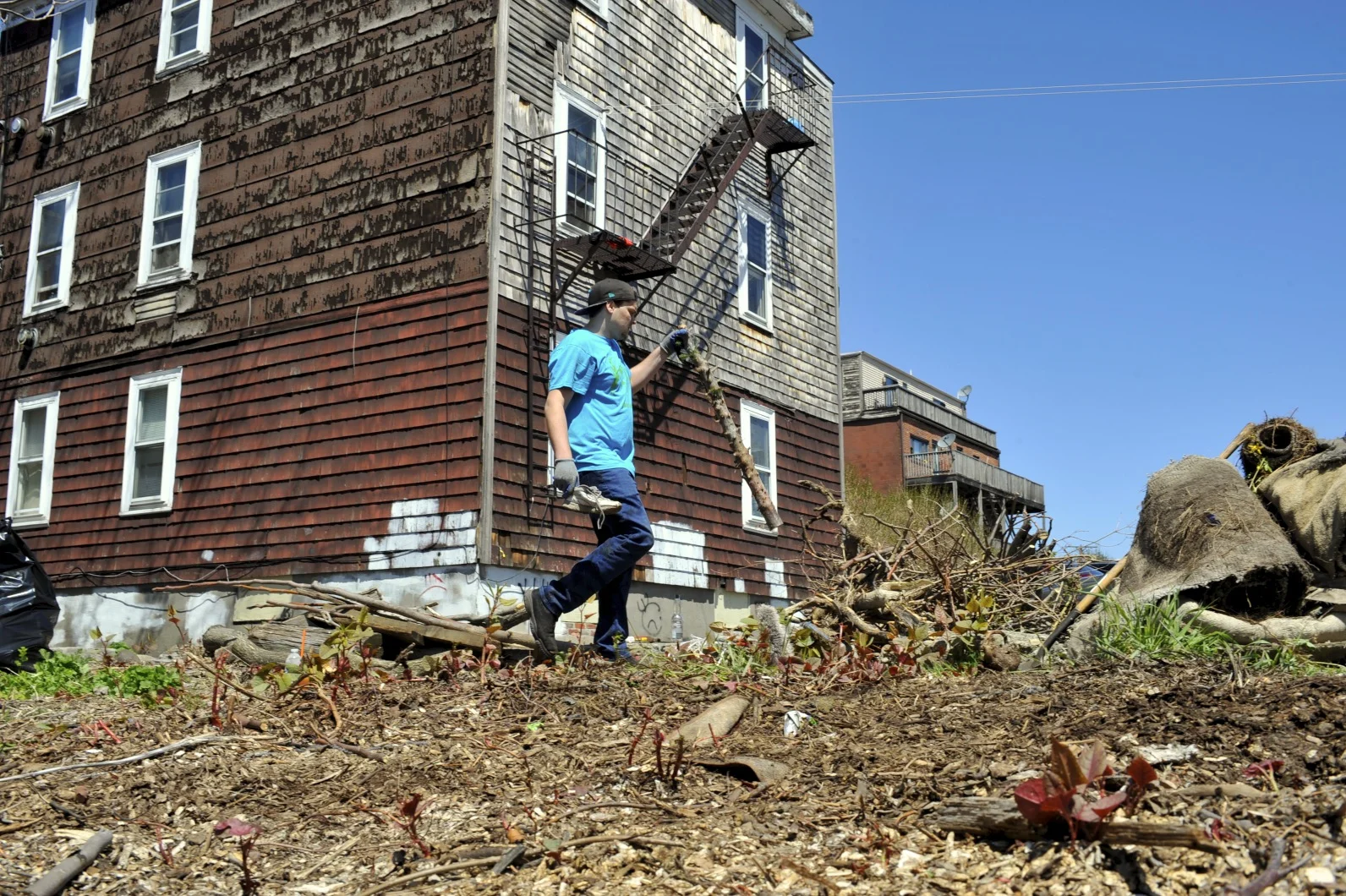 Members of the Sigma Alpha Epsilon frat worked to clean up around the Chelsea Community Gardens.