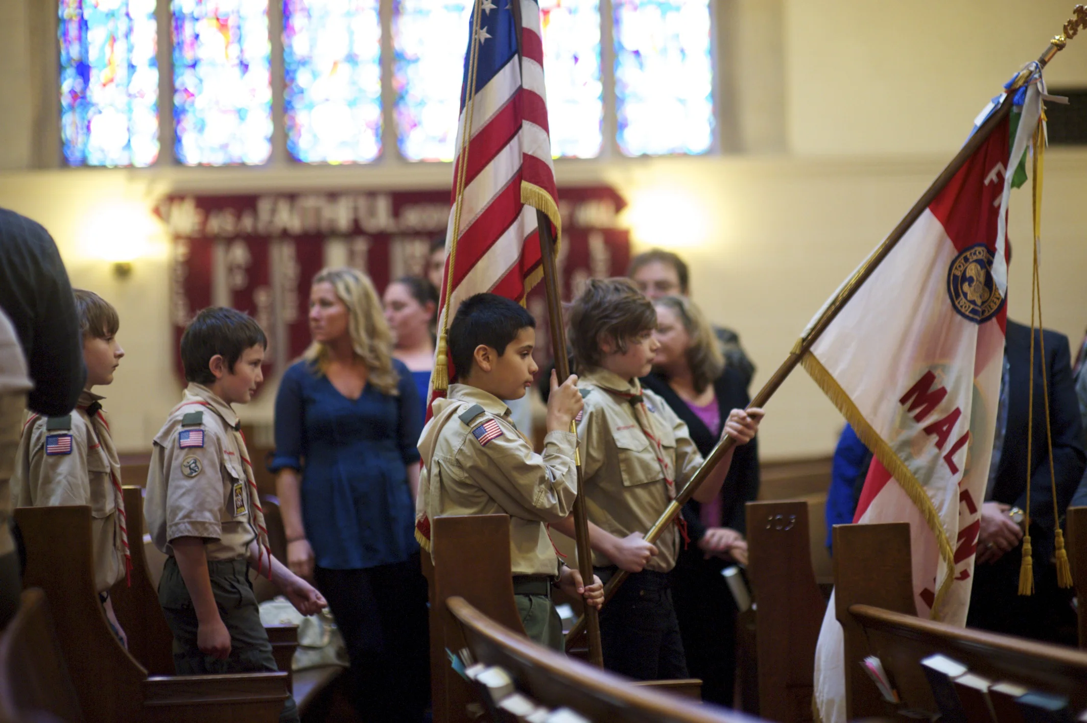Mason Burne and Geoffrey Gomez lead the way into the church as the color guard to start the ceremony.