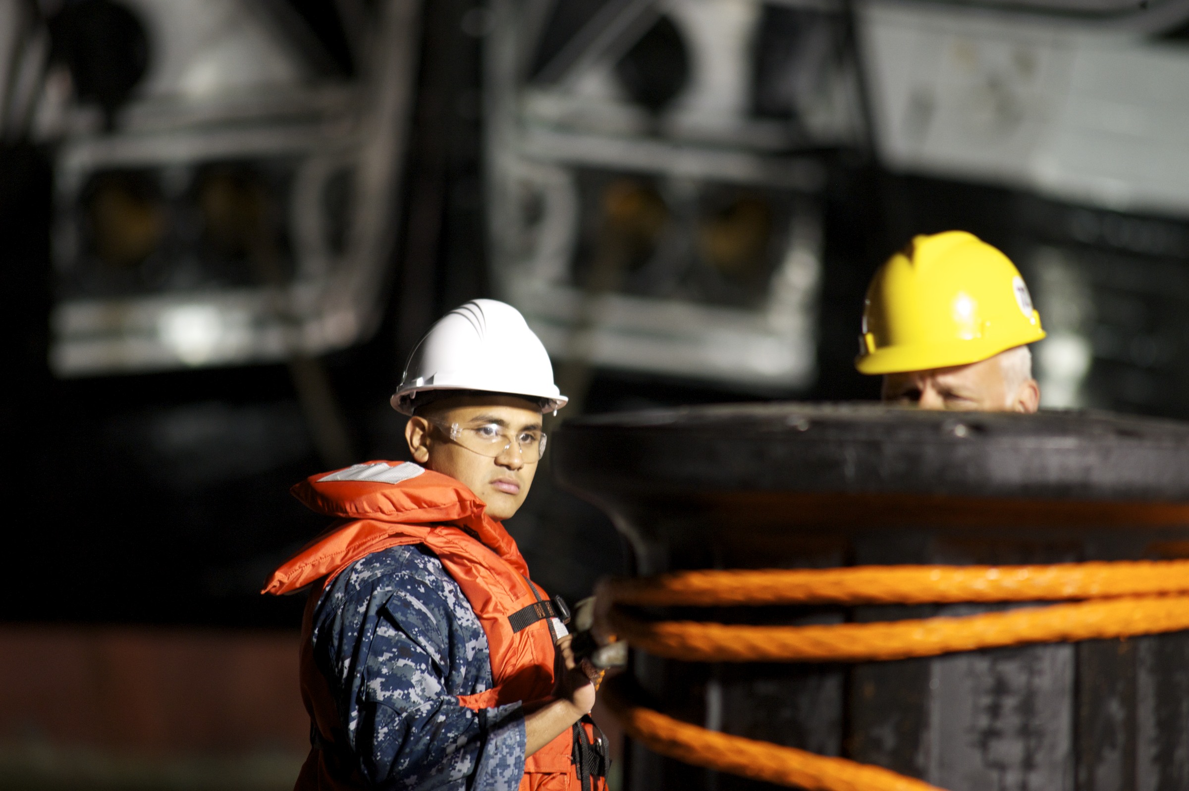 Moving an inch at a time and sometimes slower, navy engineers used lasers with digital transits to bounce off of prisms on the ship to precisely monitor the ships movement. “Divers will go in to check how she lands in the dry dock,” said three star General Willie Hilarides of Comnavsea. “It will be a very bad thing if we have to re-land her.” With that precision, the ship started to be pulled into the dry dock at around 10:20pm and by 12:30 she was in place. Now it was the job of the divers and engineers to make sure she was positioned correctly and balanced safely so that the water of the dry dock could be drained and repairs could start, which will take a few days said Commander Brawley.