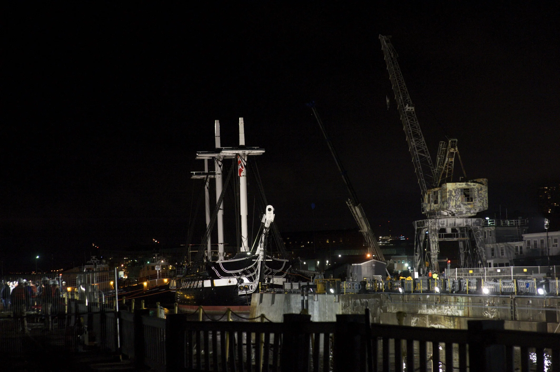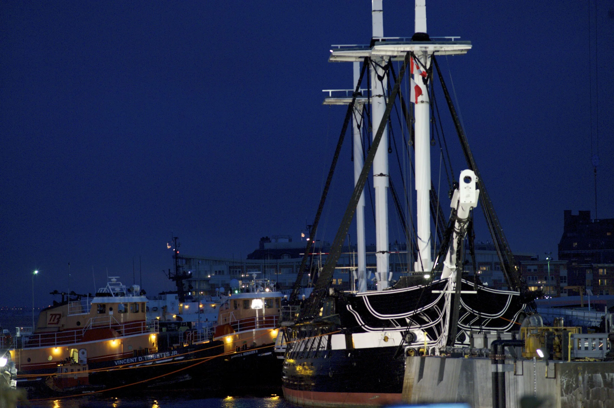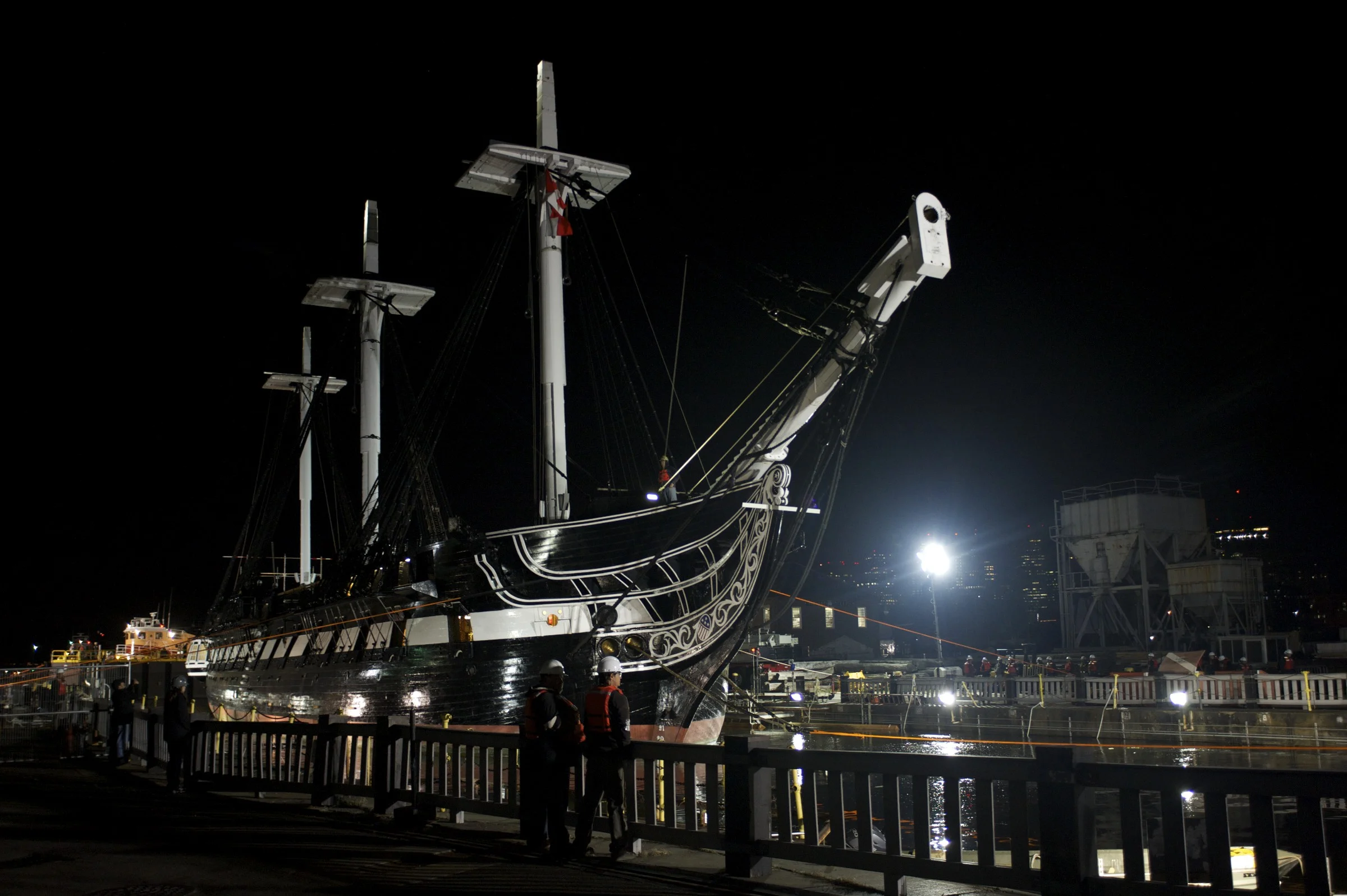 As the sun sets the constitution rest at the end of dry dock one, waiting for high tide to be ever so delicately moved into the dry dock.