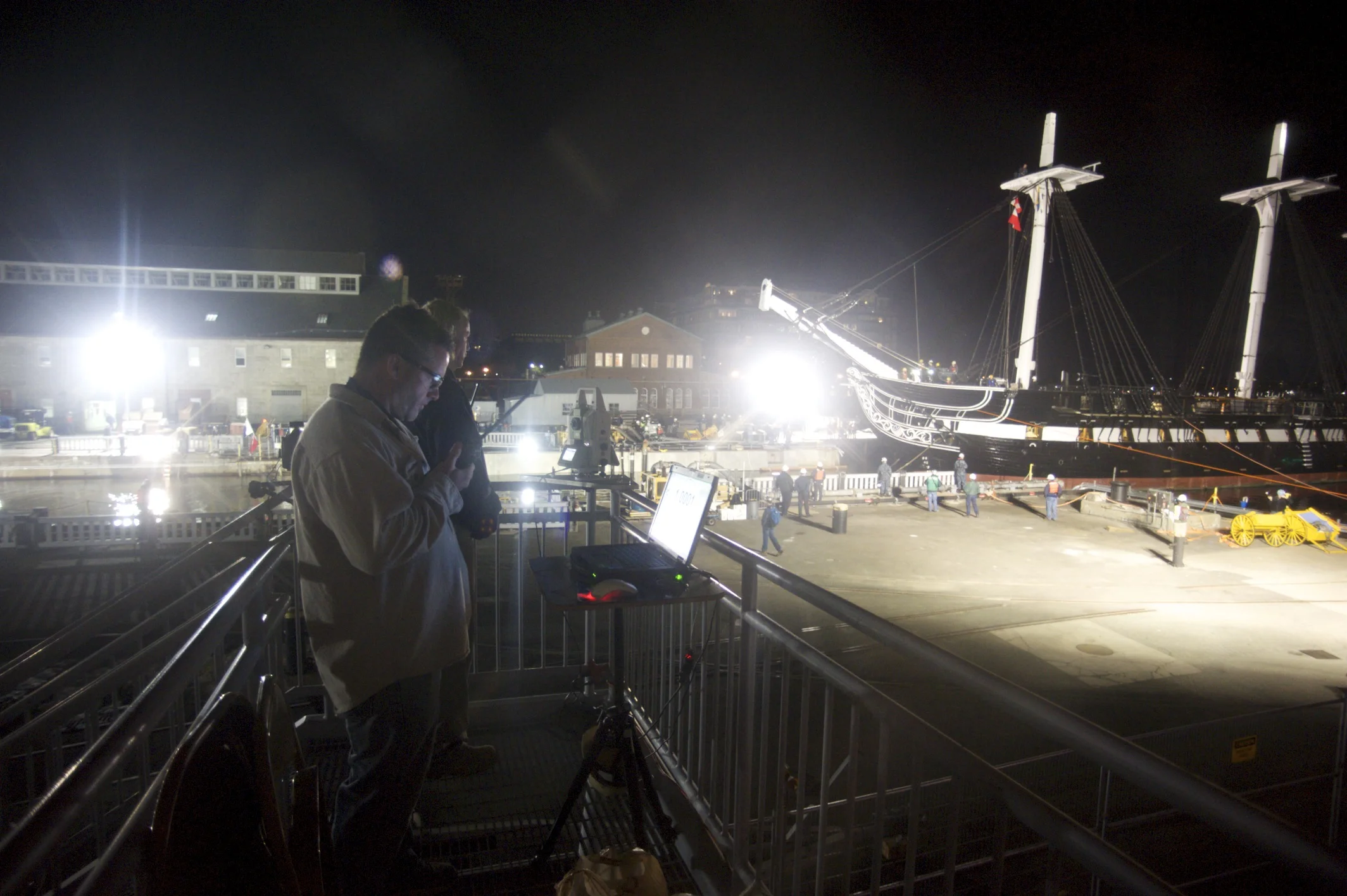 Huzza! Huzzah! Huzza! Shouted navy personal late on Monday night as a low fog rolled into Charlestown Navy yard. From Tobin Bridge the yard looked like a Friday night football game with hundreds of helmeted men and women standing in the yard, but these weren’t football players. They were Navy engineers and support staff on site at Dry Dock #1 in Boston’s historic Charlestown Navy yard. Their purpose, to safely move the USS Constitution from her pier and into the Dry Dock #1 for what will be a three year repair session for the 200+ year old ship.